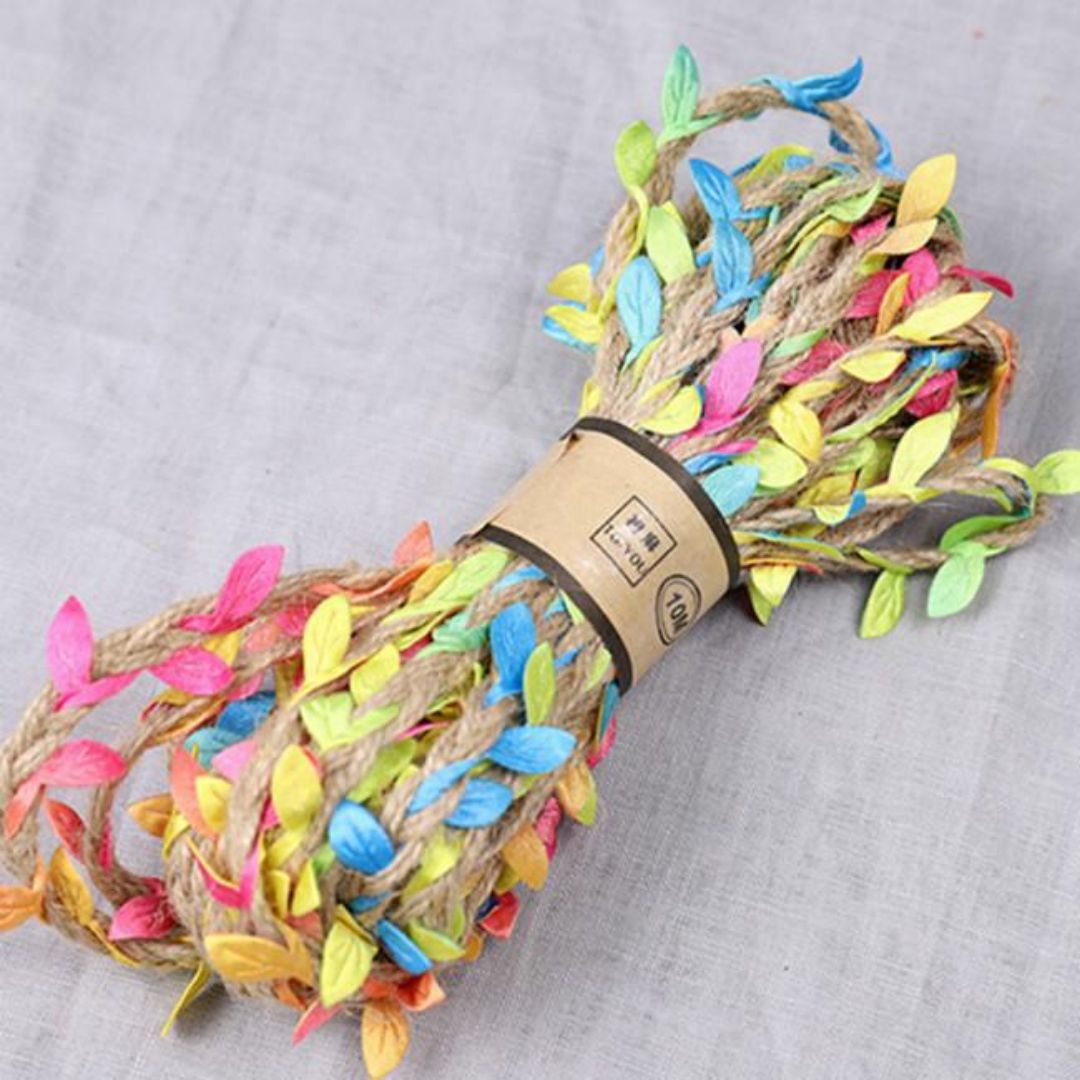 Colorful jute thread featuring vibrant leaf accents, perfect for adding a rustic yet playful touch...