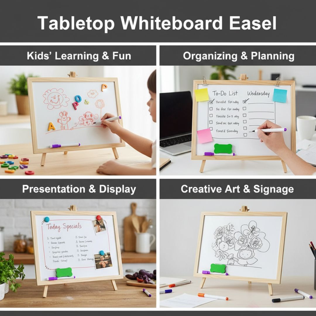whiteboard with stand, mini easel board, tabletop whiteboard, wooden easel board, dry erase board, presentation board, artist easel, study board, writing board, drawing board, educational supplies, office tools, reusable whiteboard.