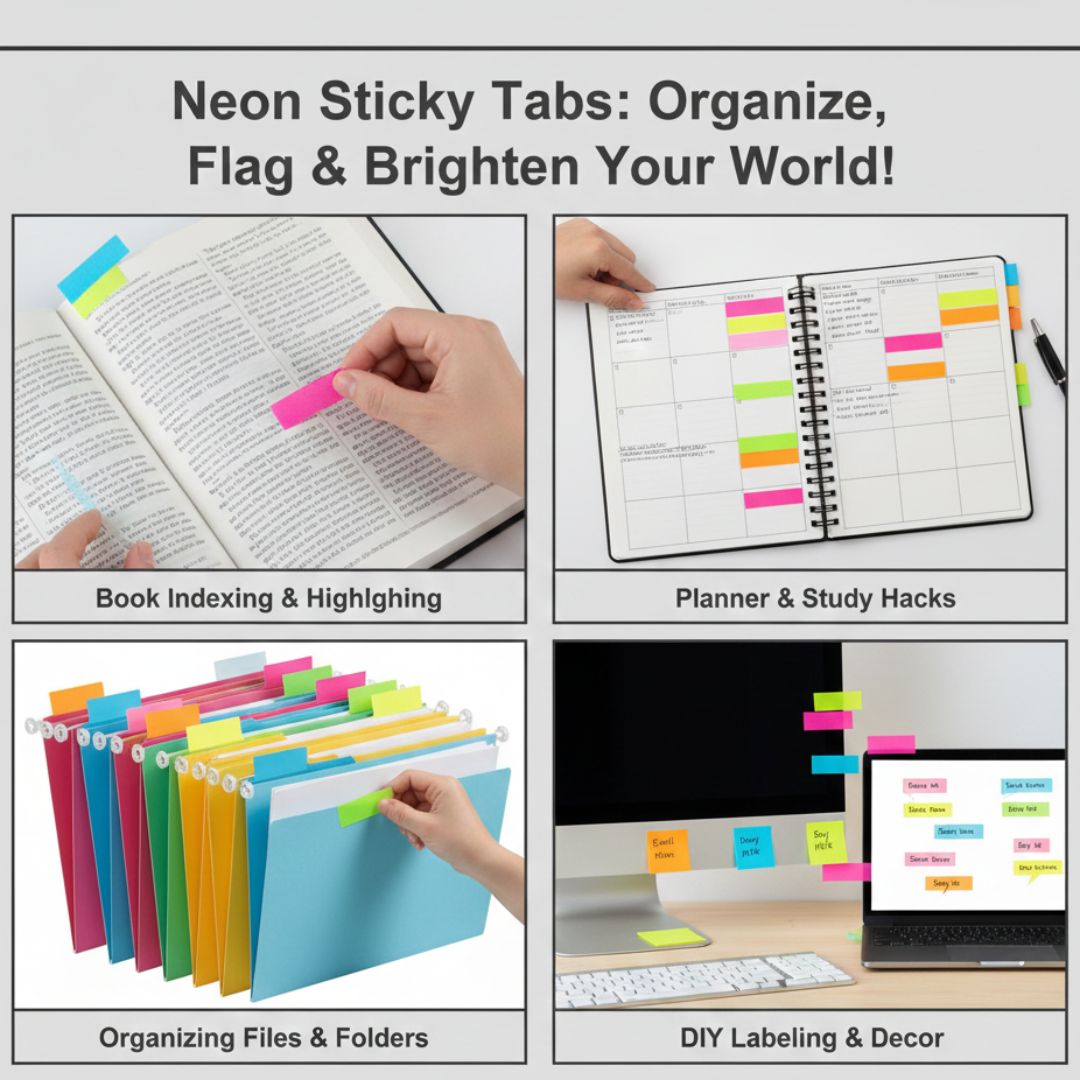 neon sticky notes, mini sticky tabs, 12x45mm sticky notes, colorful index tabs, planner tabs, study notes, bookmark tabs, office stationery, neon page markers, small sticky notes set.
