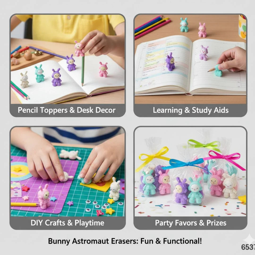 Adorable astronaut-themed rabbit eraser set, perfect for school use and gifting. Made from soft, non-toxic rubber that erases cleanly without smudges. Fun collectible design to add cuteness to stationery kits.