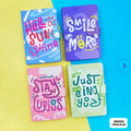 - Design: We will 90% send as shown in image. The image displays a set of colorful diaries with different uplifting quotes; the one you receive will feature one of these vibrant designs and positive messages.