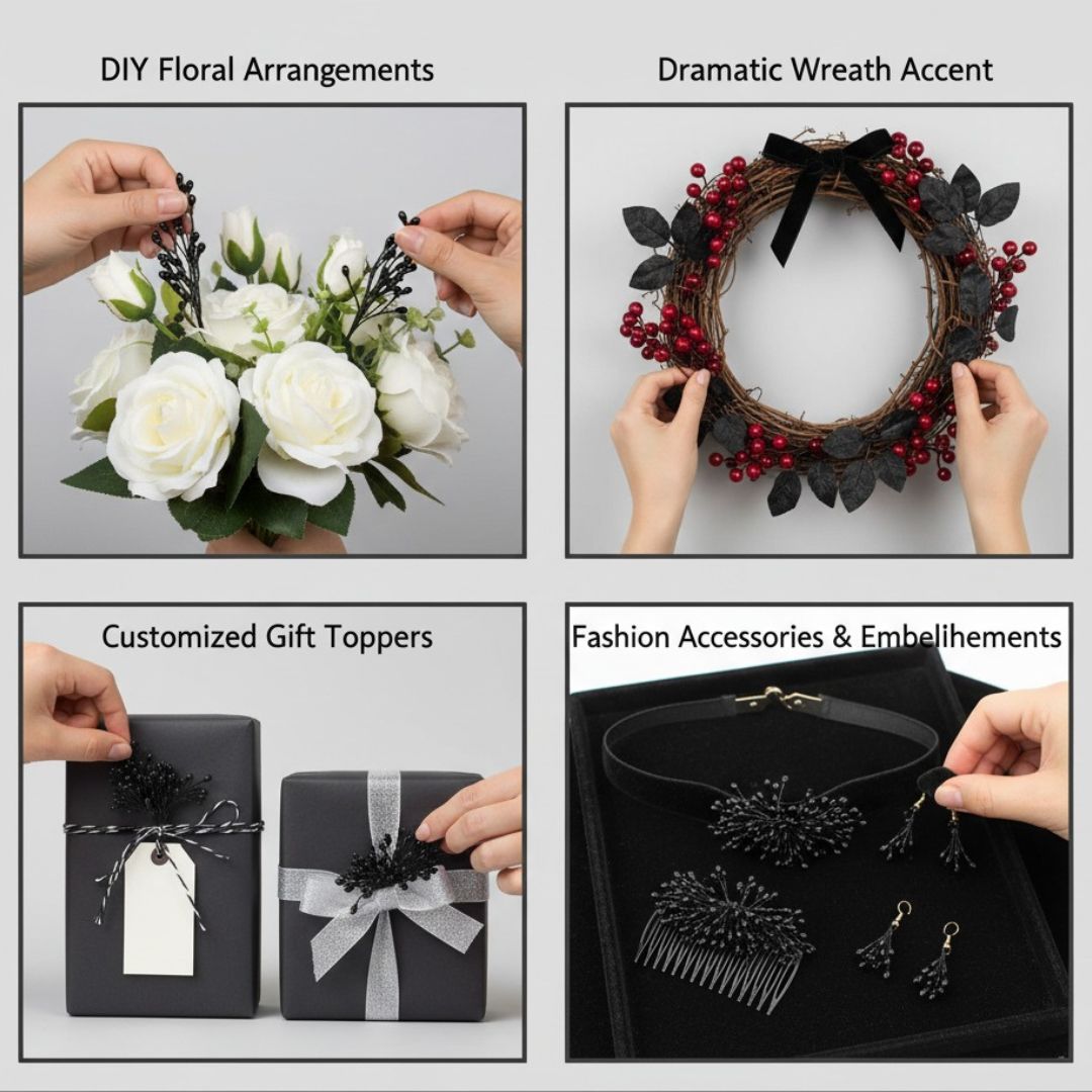 artificial flower pollens, black floral stamens, craft flower materials, flower making supplies, DIY craft accessories, artificial flower parts, bouquet making items, handmade flower craft, floral decoration materials, artificial pollen bunch.