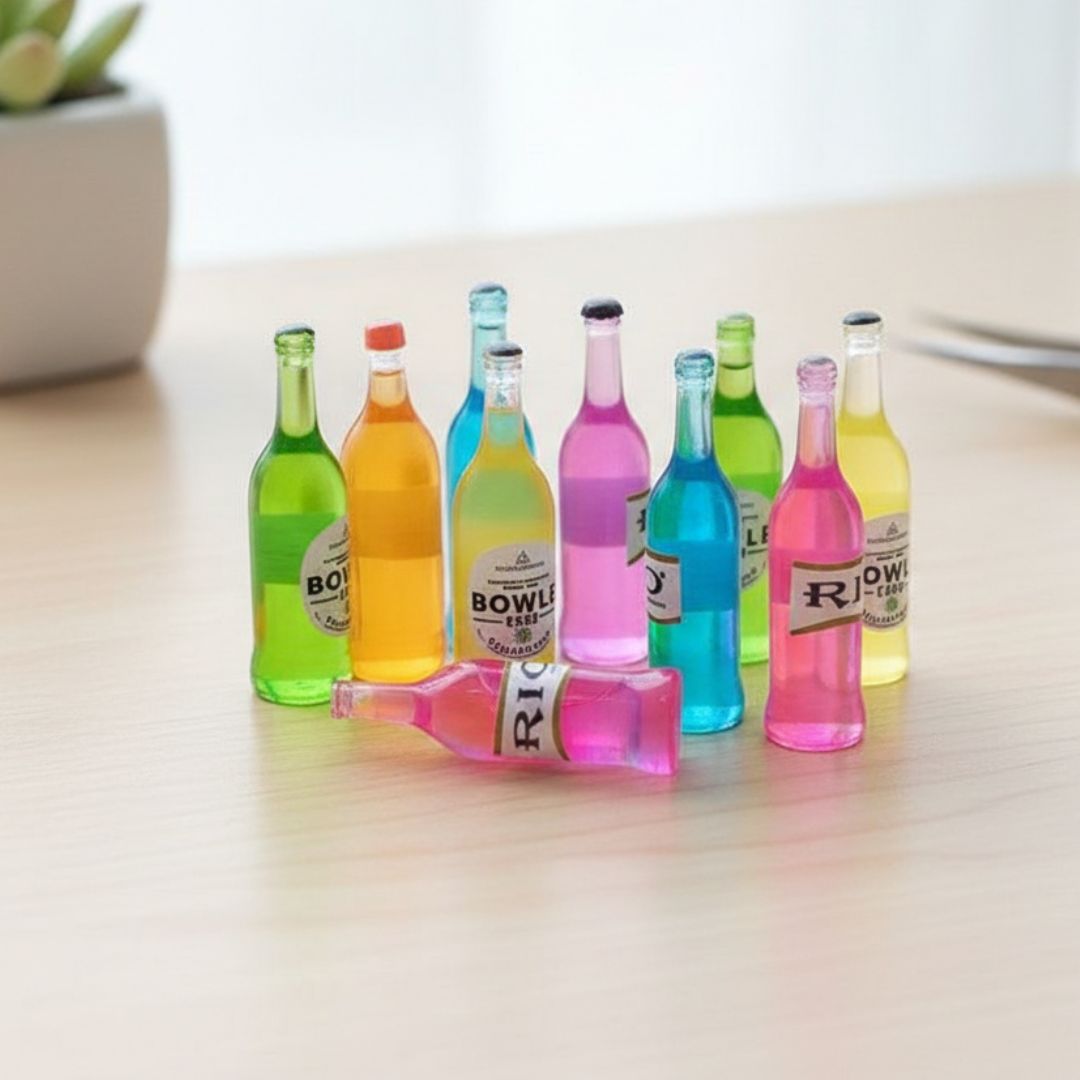 Miniatures Mix Colorful Bottles 10 Pcs Pack o : f 1This miniatures mix colorful bottle set includes assorted tiny bottles in bright, eye-catching colors. Designed for decorative and craft use, these miniature bottles are lightweight and compact, making them ideal for creative DIY projects, resin art, scrapbooking, and miniature setups.
