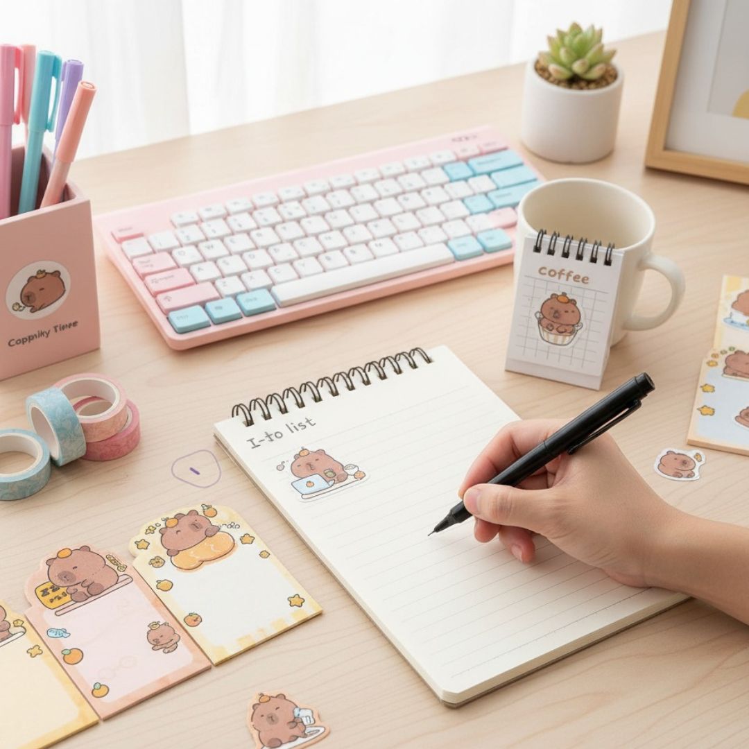 (Buy 1 Get 1 Free) Cute Capybara Sticky Notes | Pack of 1 | Contains 3 Designs. Make your notes extra adorable with these Cute Capybara Sticky Notes! Perfect for journaling, planners, study reminders, or even leaving little love notes, each sheet features the sweetest Capybara designs in cozy, café-style themes. The pastel tones and chonky capybara illustrations give major kawaii vibes — perfect for stationery lovers!
