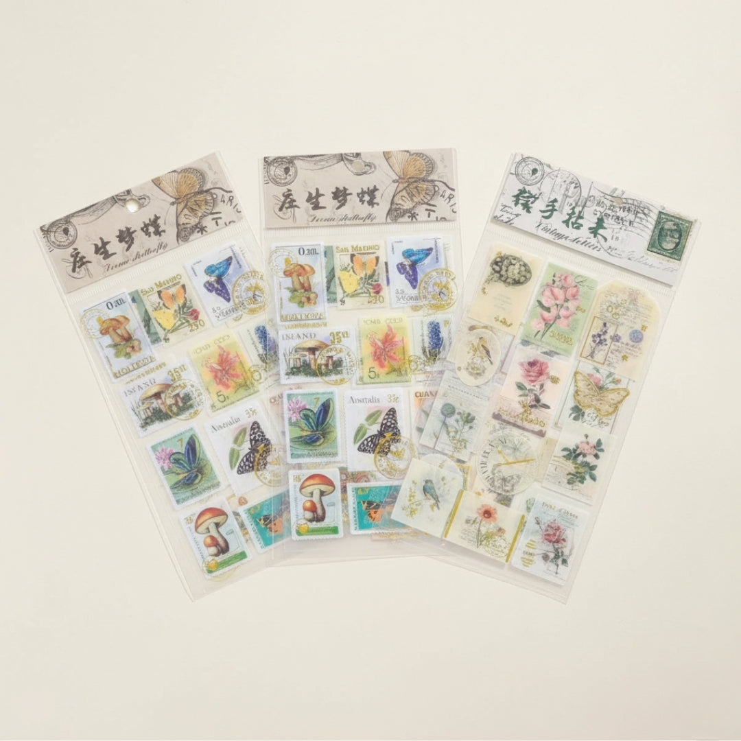 vintage botanical stickers, postage stamp stickers, floral vintage stickers, journal stickers, scrapbook embellishments, aesthetic stickers, retro paper stickers, botanical journal decor, collage stickers pack, vintage stationery stickers
