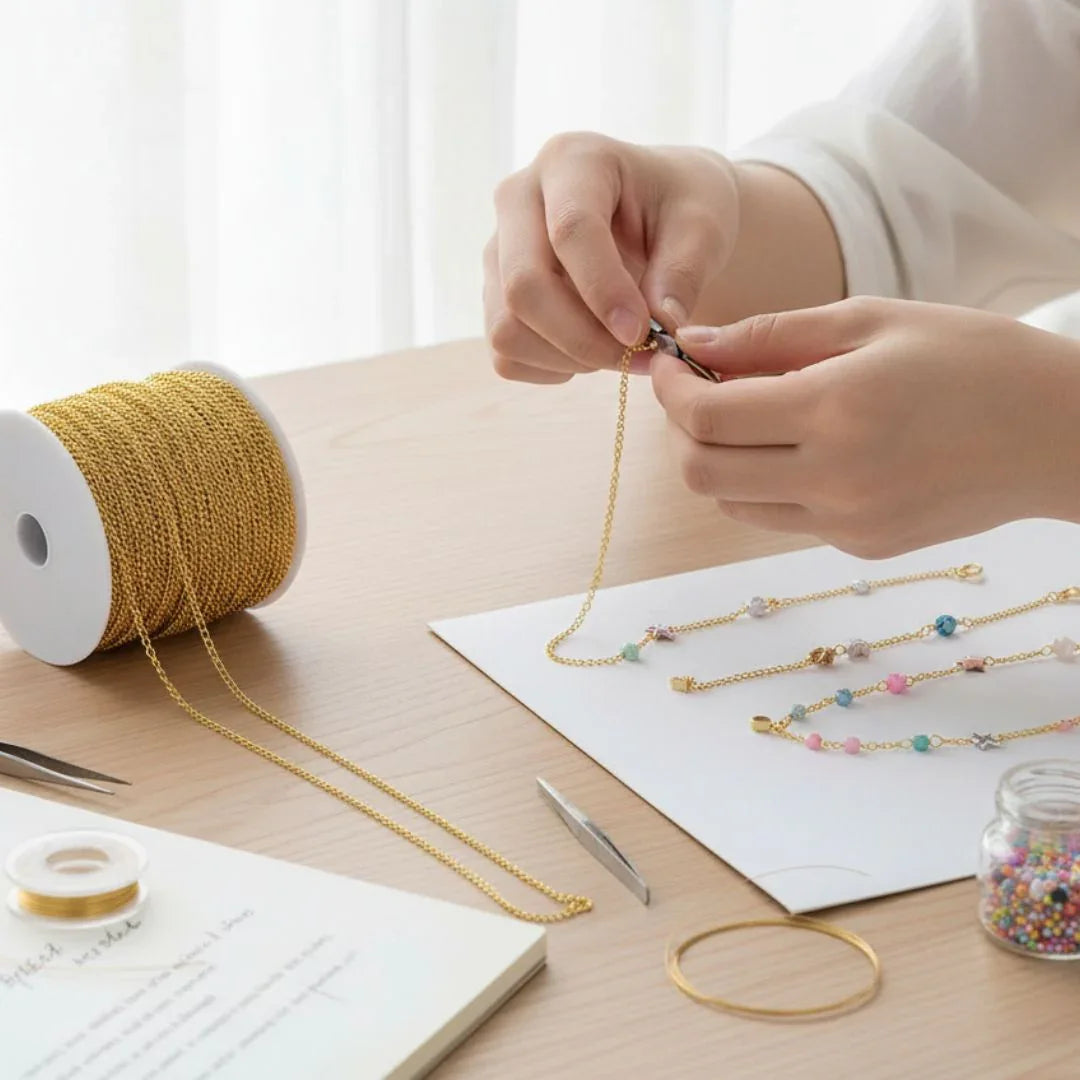 Gold Craft Chain | 1.5 Meter | 0.7mm Link Size | Code: CC0715G. This premium gold craft chain is perfect for jewelry and DIY accessory making. With its fine 0.7mm link design and shiny finish, you can use it for pendants, bracelets, keychains, resin art, and decorative projects. It's flexible, easy to cut, and super versatile — a total must-have for craft lovers.
