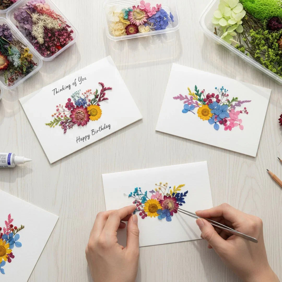 Each box comes with a beautiful mix of preserved and dried flowers in vibrant shades — perfect for resin art, journaling, scrapbooking, or handmade card decoration. These flowers instantly elevate your projects with a touch of nature and color.