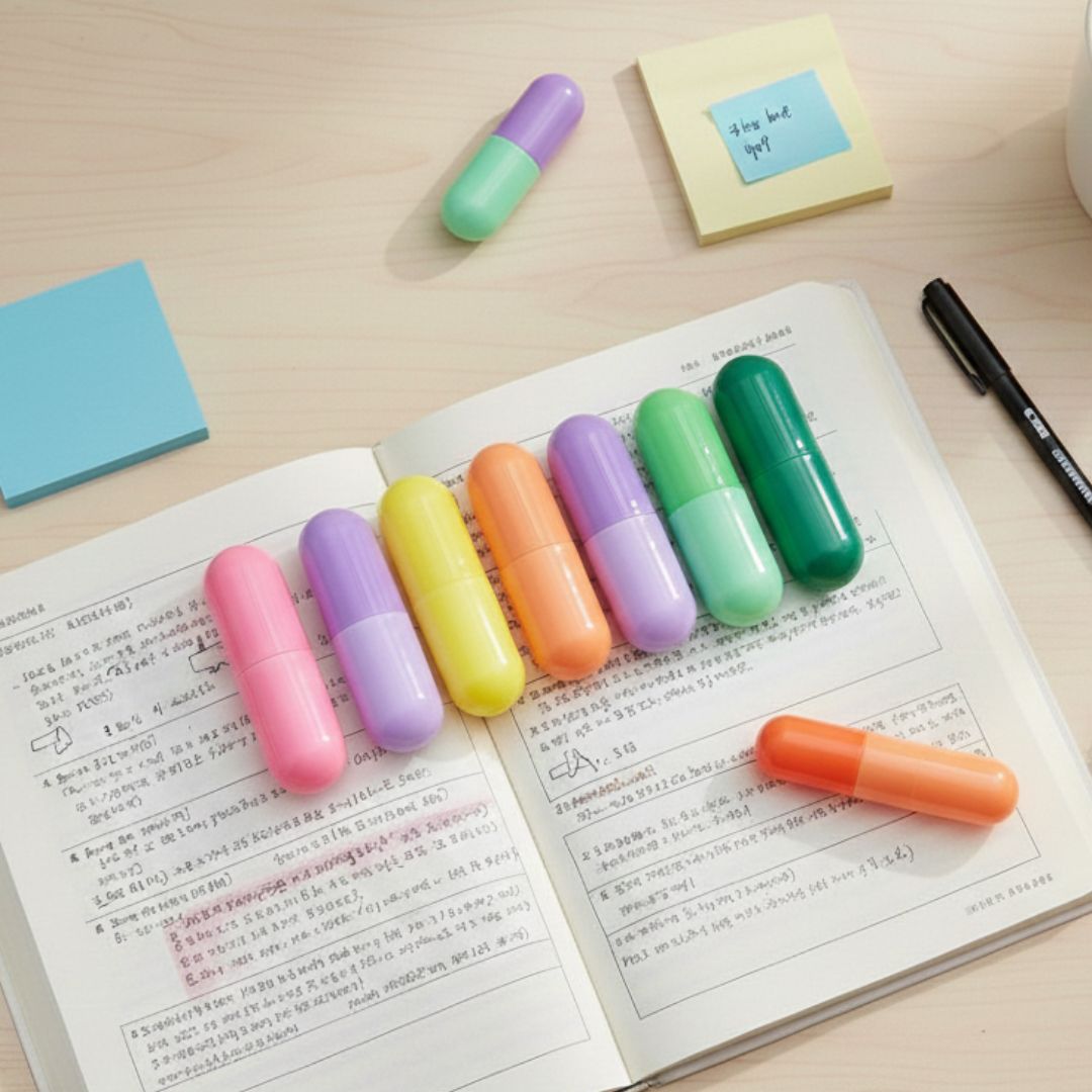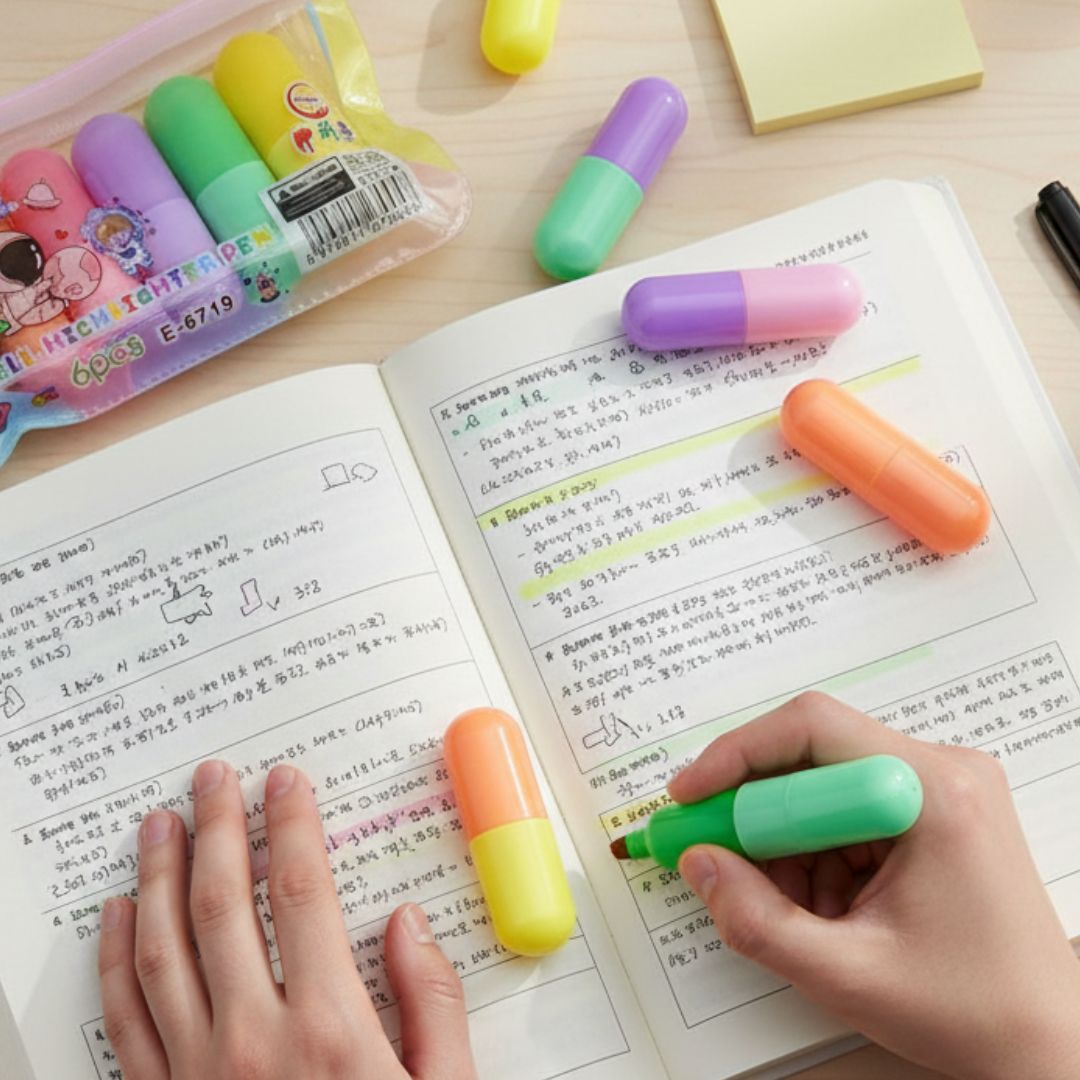 Cute Space Capsule Highlighter Set (6 Pcs) | Pack of 1: Highlighter goals but make it cute This space capsule–style highlighter set comes in soft pastel shades packed inside adorable capsule-shaped bodies. Compact, smooth to use, and super aesthetic, these highlighters are perfect for study sessions, notes, planners, and journaling without the mess.