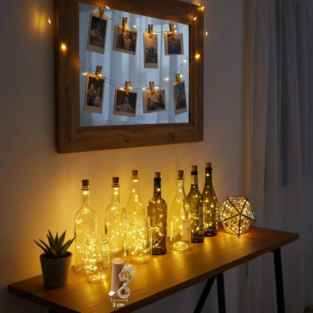Light up your vibe with these adorable Fairy Lights — perfect for cozy corners, bottles, or decor setups! These mini LED lights come with a cork-style switch, giving off a warm golden glow that adds instant aesthetic feels to any space