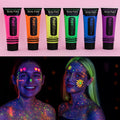 neon body paint, glow in the dark makeup, UV face paint, party makeup, festival body paint, washable neon paint, blacklight makeup, luminescent colors, rave accessories, bright neon tubes, safe body paint, water-based UV paint.
