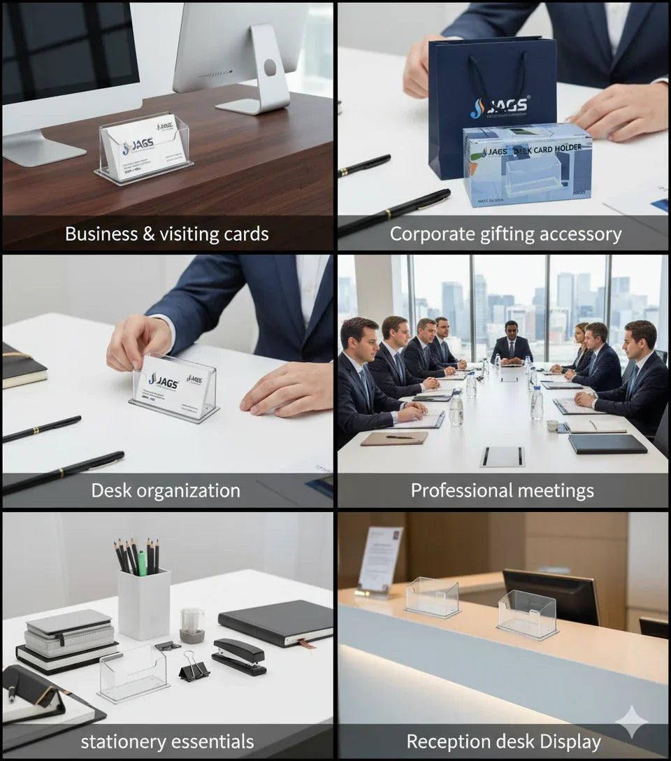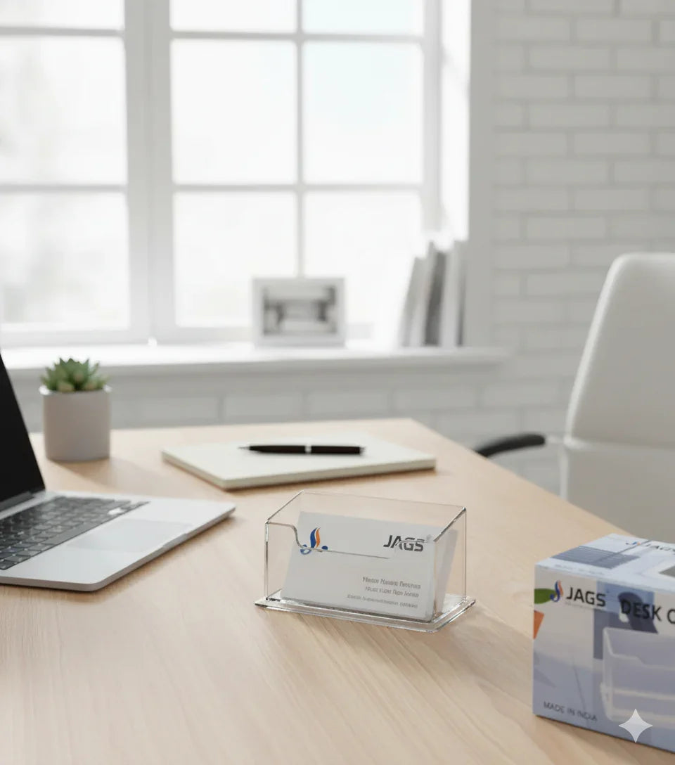 Keywords : Desk card holder, Jags card holder, JDBC00 model, Business card organizer, Office desk accessory, Card display stand, Name card holder, Professional desk organizer.Model JDBC00, Sleek and compact design, Sturdy wooden construction, Keeps cards organized $\&$ visible, Perfect for office, reception, or home desk, Professional and aesthetic look, Durable $\&$ smooth finish.
