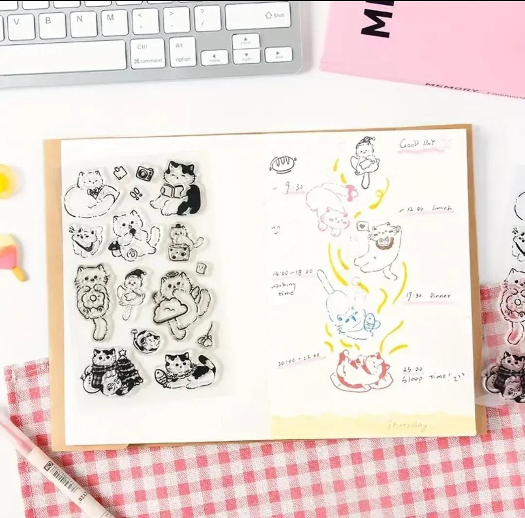 Cute Kitty Mini Clear Rubber Stamps – 1 Sheet with 14–17 Cat-Themed Designs for Journaling, Scrapbooking & DIY Crafts