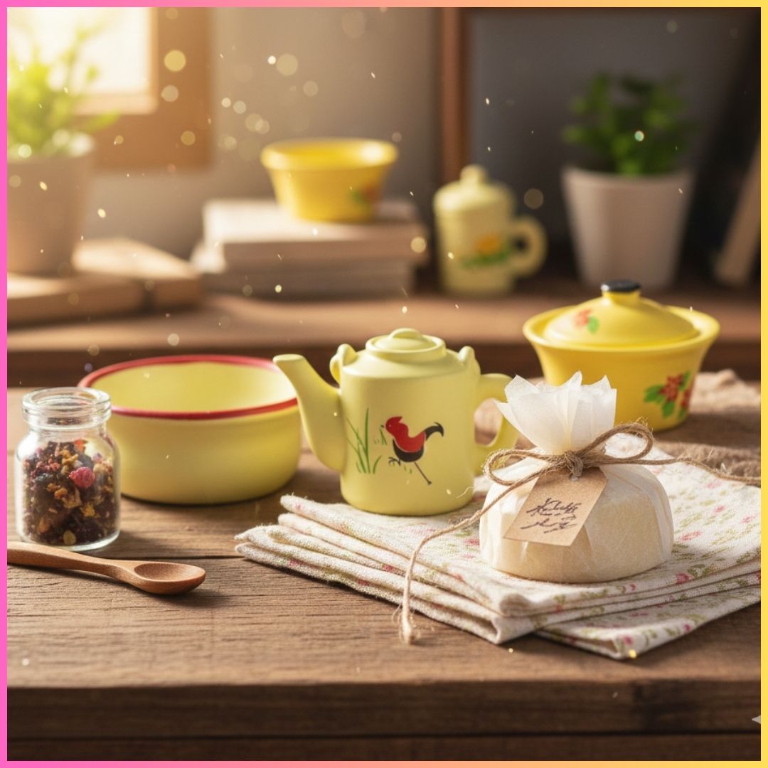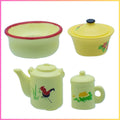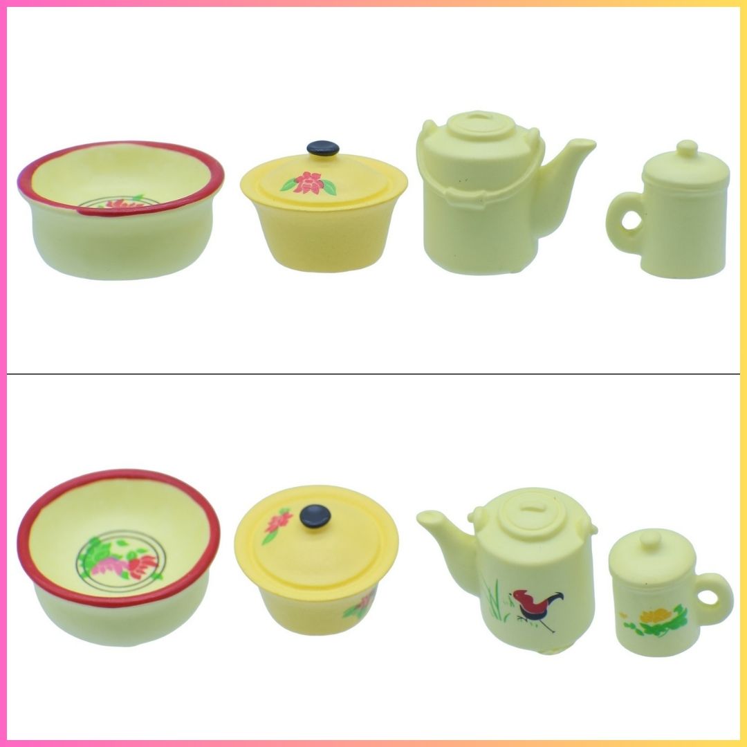 Miniature Vintage Kitchen Set | 4 Pcs Cute Yellow Cookware Décor: Bring some retro grandma-kitchen vibes to your dollhouse or craft scene with this adorable 4-piece yellow miniature kitchen set. The painted florals and tiny rooster teapot are legit ✨iconic✨ — perfect for dioramas, resin trays, fairy gardens, or collectors who love tiny aesthetic things.