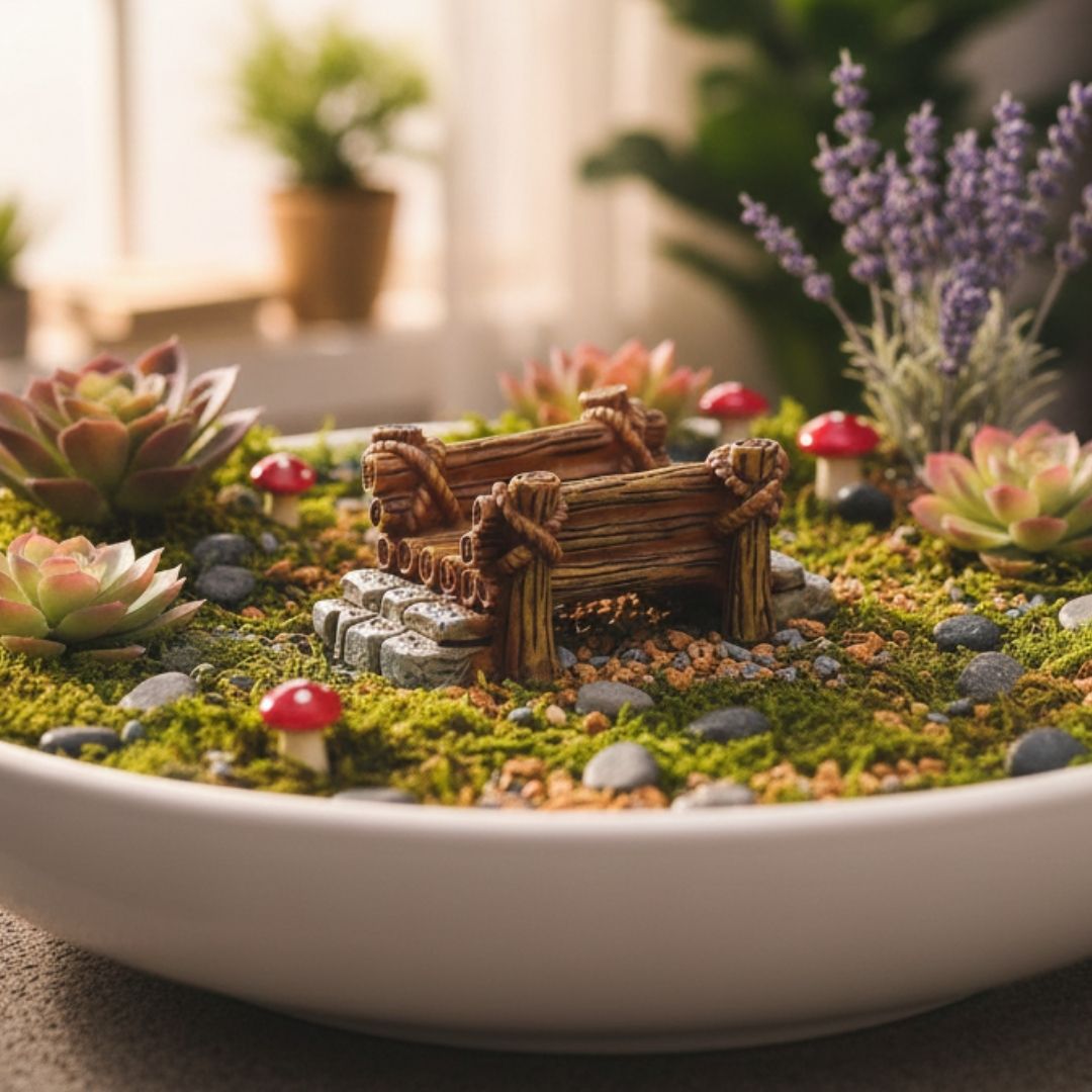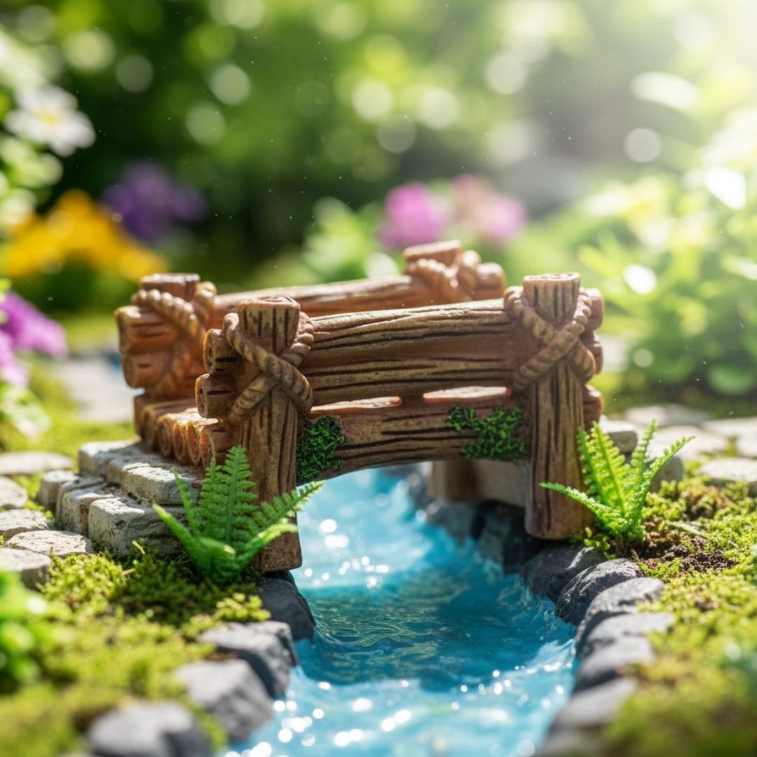 Keywords: mini wooden bridge, fairy garden décor, dollhouse accessories, resin scenery props, miniature craft supplies, rustic bridge model, small landscape decoration.