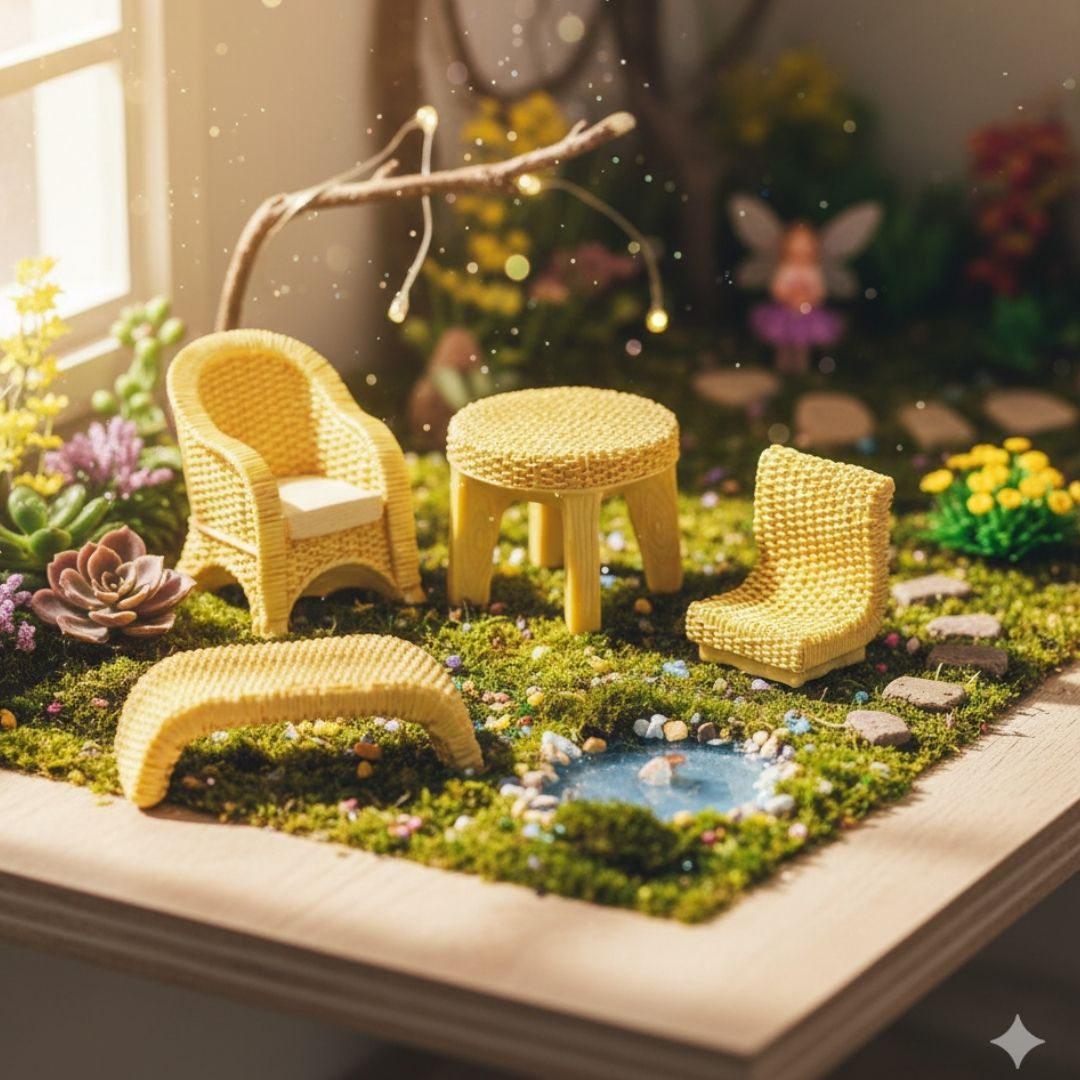 Miniature Yellow Furniture Set | 5-Piece Dollhouse & Craft Décor Kit: This adorable 5-piece mini furniture set is perfect for dollhouses, school projects, terrariums, fairy gardens, resin dioramas, and aesthetic craft scenes. The woven-style texture and soft yellow colour give it a cute, cozy vibe — totally leveling up any miniature setup ✨🌼