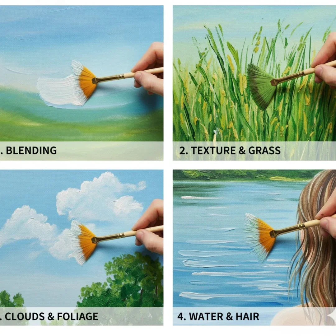 High-quality fan paintbrush made with soft taklon bristles for smooth and even strokes. Ideal for blending, shading, and creating texture in acrylic, watercolor, and oil painting. Lightweight wooden handle for better control.
