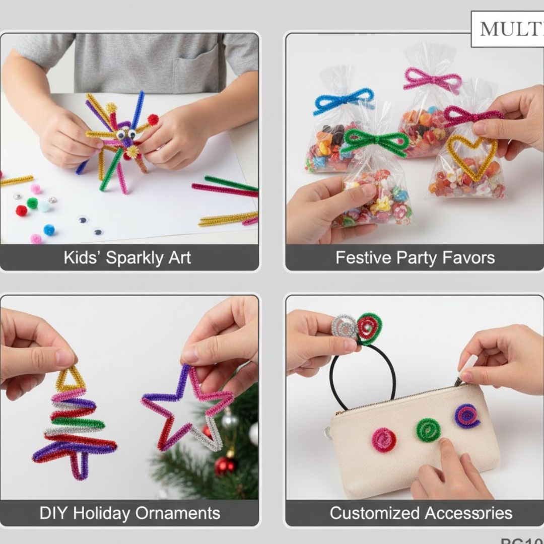 glitter pipe cleaner, multicolor metallic stems, craft tinsel wire, chenille stems, art and craft material, bouquet wire, sparkly craft sticks, floral DIY accessories, handmade décor supplies, shiny craft pipe cleaners