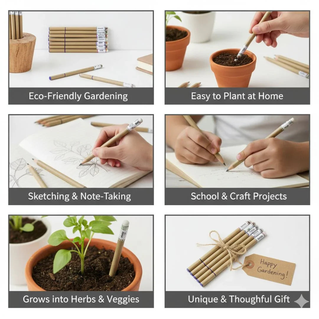 Each pen is made from recycled paper and contains plant seeds at the end — after use, just plant it in soil and watch it grow into herbs or veggies like spinach, beans, methi, and more!