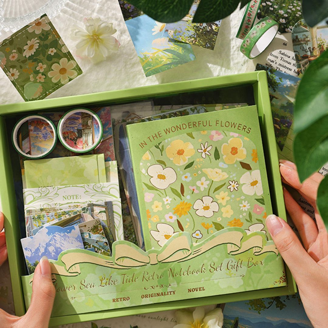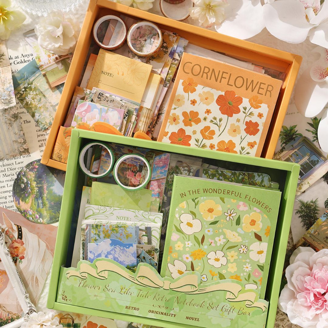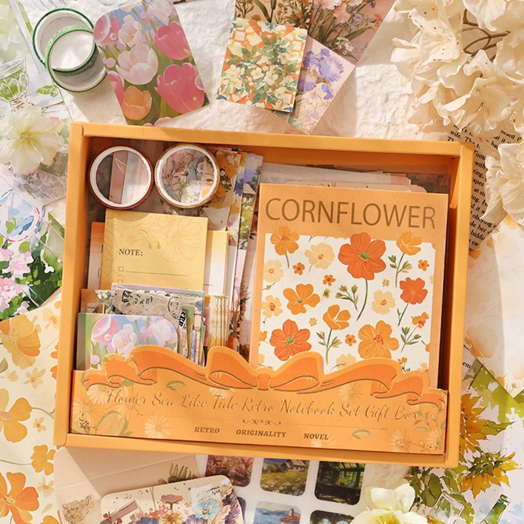 Keywords: floral journal gift set, retro notebook combo, aesthetic stationery box, flower theme notebook set, washi tape gift set, cottagecore stationery kit, scrapbook journal combo, premium floral gift hamper, journaling starter kit, cute stationery gift set