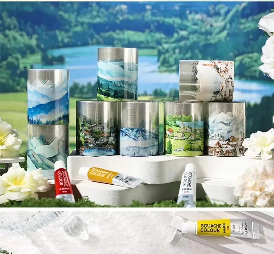 Pack Includes: 4 scenic washi tape rolls with unique mountain-themed designs