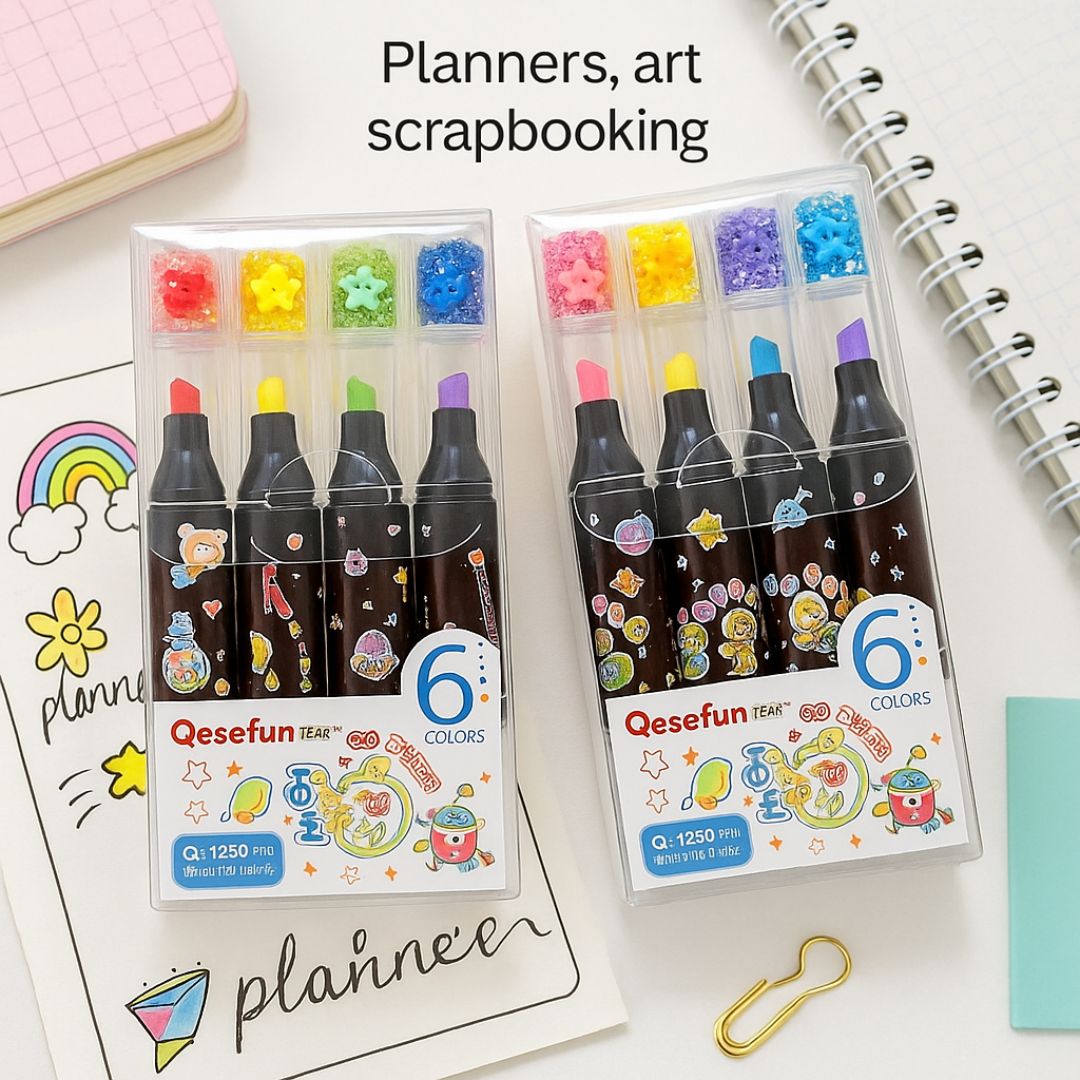 cute pastel highlighters, kawaii glitter marker set, aesthetic school stationery, 6 color pastel markers, journaling highlighter set, cute cartoon markers, Q1290 highlighters, kawaii desk supplies, pastel study highlights, adorable stationery gifts