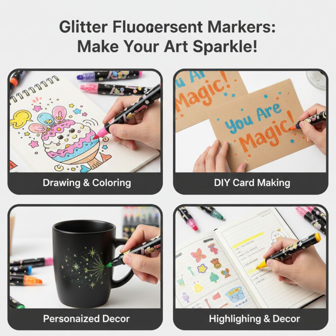 These highlighters aren’t just markers… they’re a whole vibe! Each pastel shade comes with an adorable cartoon design + a matching glitter cap filled with tiny decorative shapes. Perfect for notes, journaling, planners, school work, aesthetic stationery setups, and creative doodles.
