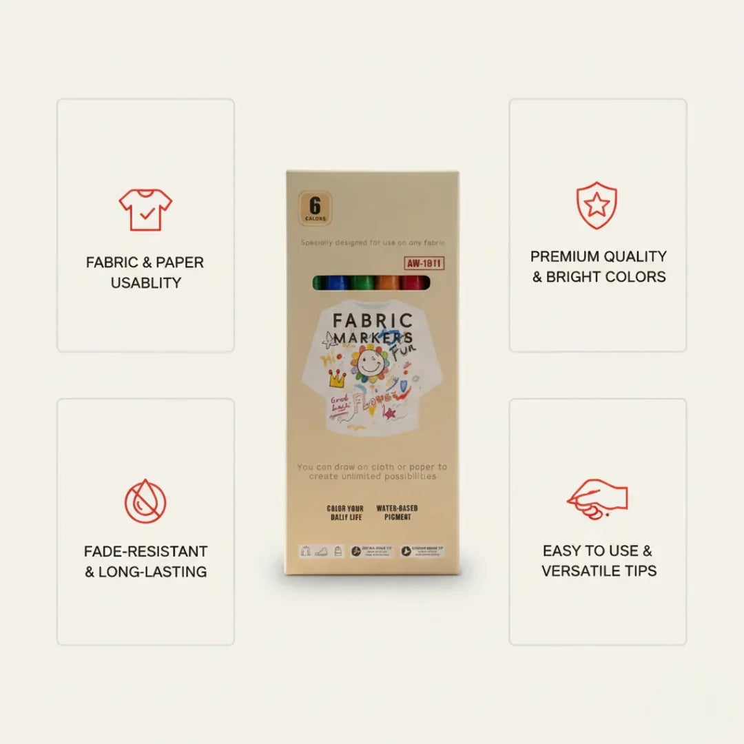 Waterproof Fabric Markers – 6 Color Set (1 Pack) : Add a pop of color to your tees, tote bags, shoes, or any fabric with these waterproof fabric markers! The vibrant shades glide smoothly, dry fast, and stay put — no smudging, no fading, just pure creative vibes. Perfect for DIY projects, school crafts, custom clothing, and aesthetic doodles. 🎨💛