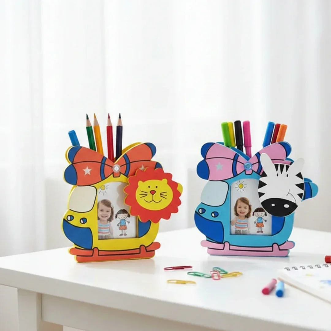 Keywords: wooden pen stand, helicopter pen stand, kids desk organizer, cute pen holder, wooden stationery stand, animal themed pen stand, colourful desk accessory, study table organizer, kids room décor, gift for kids