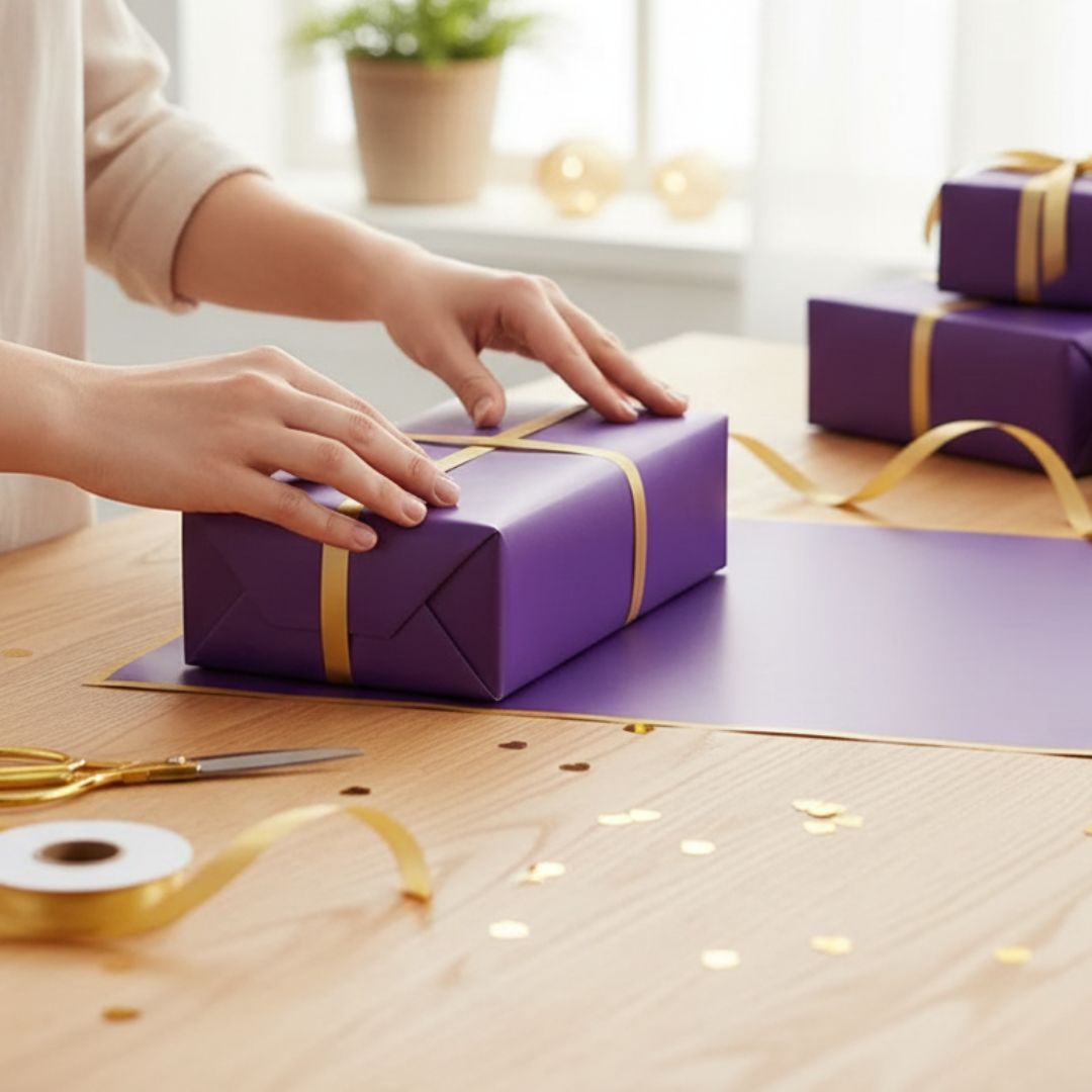 This wrapping paper is serving pure luxury vibes, fr! The bold royal purple paired with that sleek gold border makes every gift look straight-up high-end. Whether you're packing hampers, bouquets, birthday gifts, festive boxes, or décor DIYs — this premium sheet literally levels up everything it touches. Smooth texture, crisp finish, and that rich color combo? Chef’s kiss. Perfect for aesthetic gifting, events, and small business packaging!