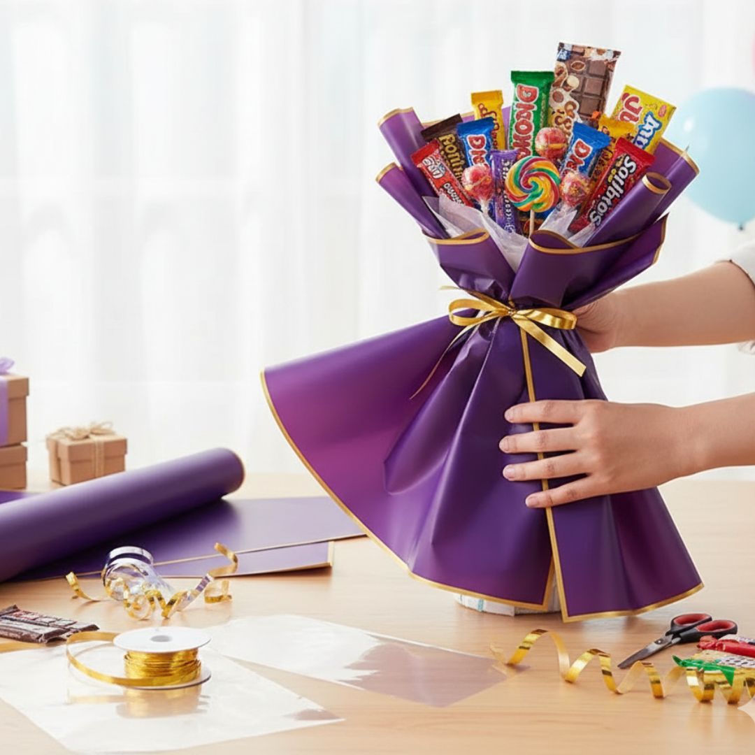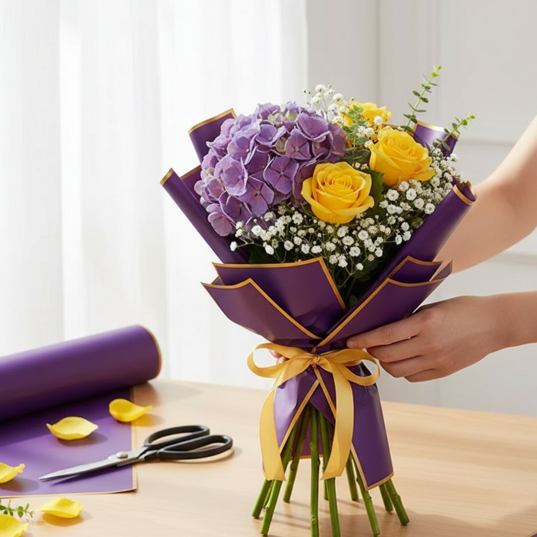 purple gift wrap, luxury wrapping paper, gold border sheets, premium bouquet wrapping, aesthetic gift wrapper, hamper packing sheets, festive wrapping paper, elegant packaging sheets, vibrant color wrapping sheets.
